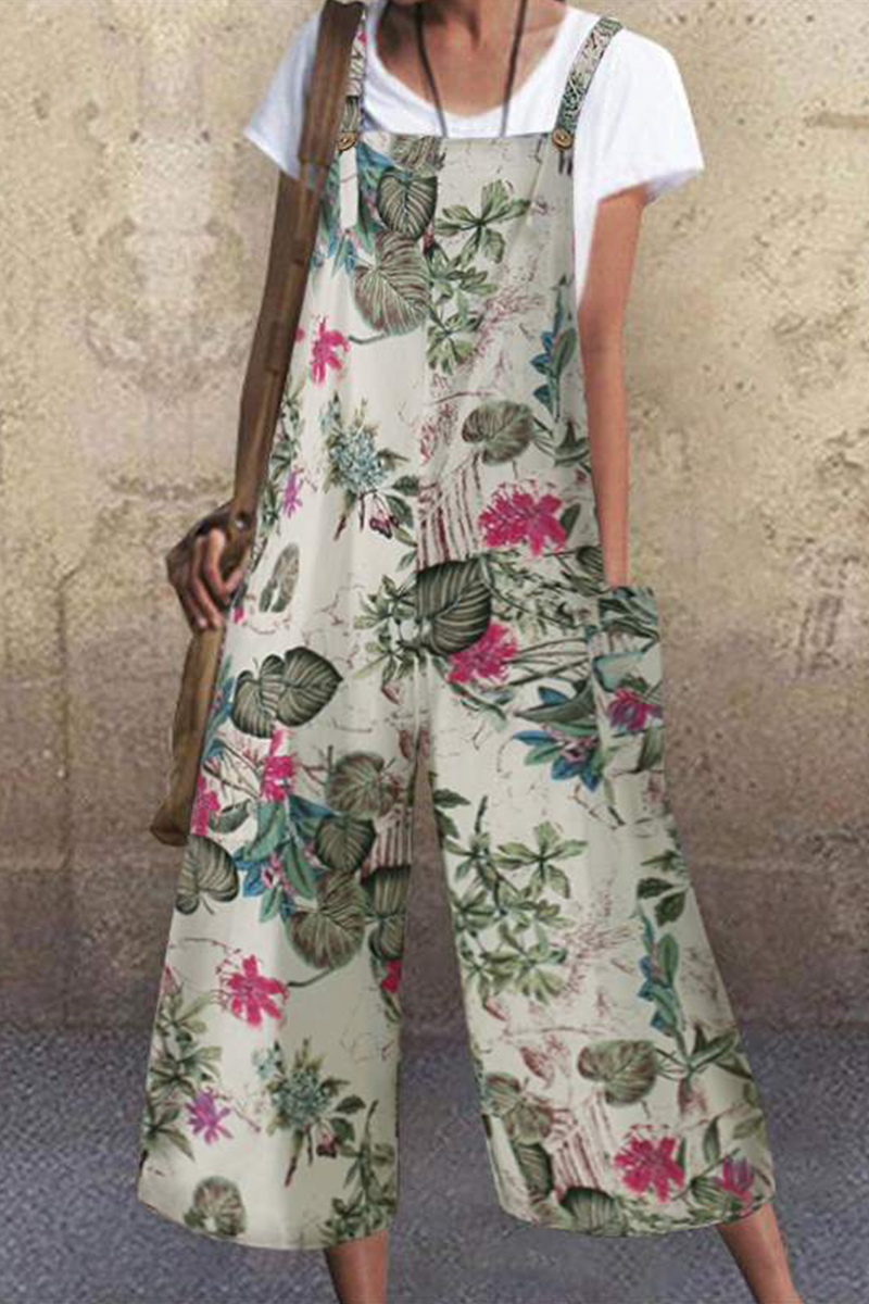 Casual Print Pocket Buttons Capris Square Collar Loose Jumpsuits(3 Colors)